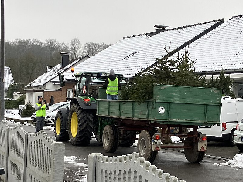 Die Tannenbäume werden auf die Anhänger der Traktoren verladen, und die Spenden sammeln wir direkt an Ihrer Haustür ein.